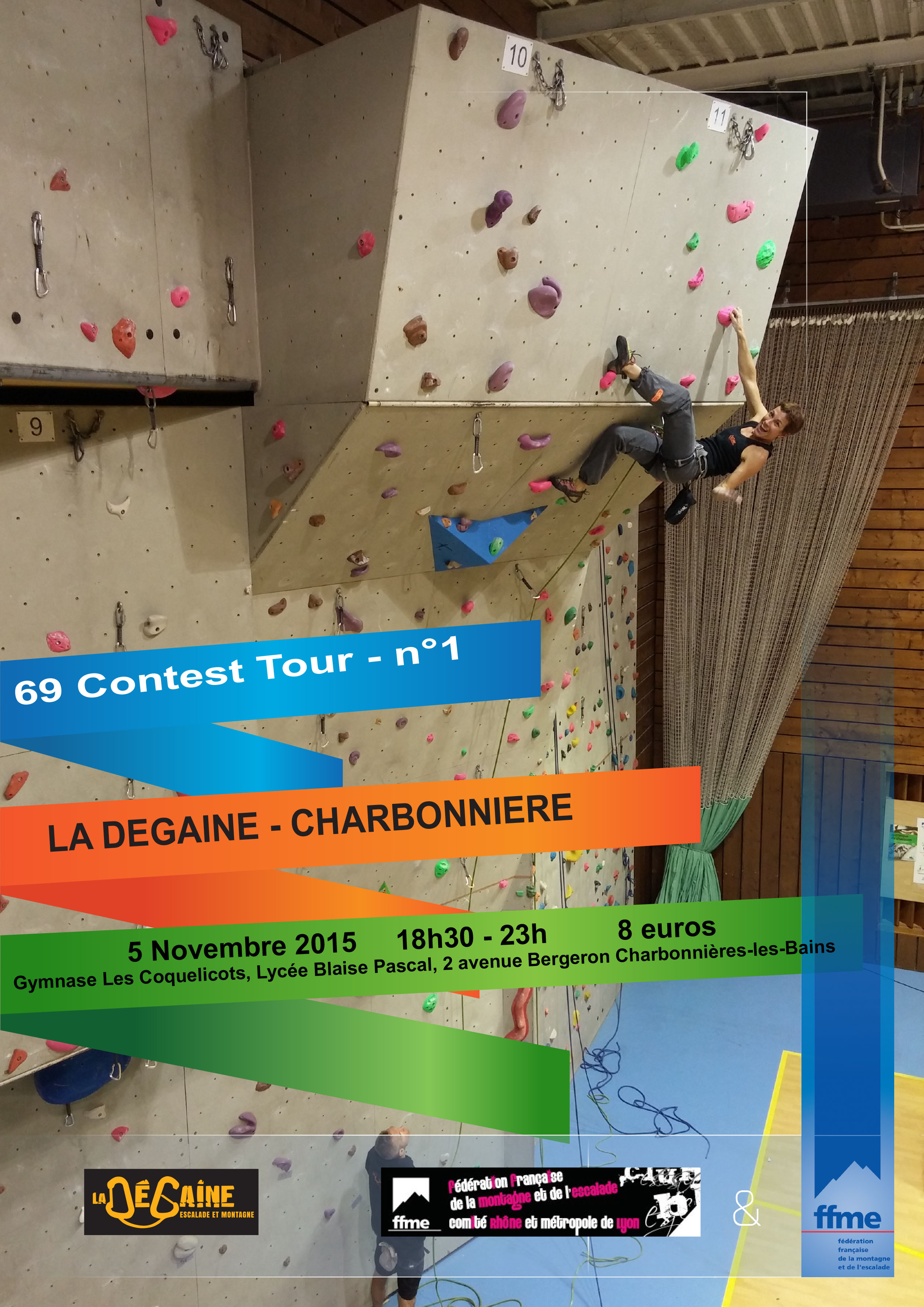 La première étape du 69 Contest Tour débarque : - jeudi 5 novembre à partir de 18h30 (possibilité d'arriver plus tard) - entre 20 et 30 voies neuves (tramage en cours...) - du 4b au 7b - contest amical - classement scratch - à partir de cadet - 8 euros - inscription sur place - A charbonnière - club : La Dégaine.