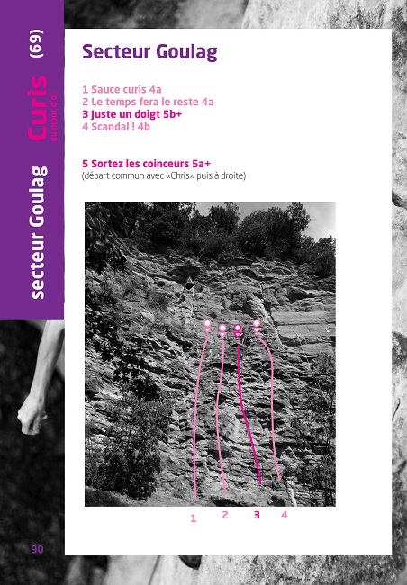 Pour ce qui est du topo, le site de Curis est à retrouver dans le guide “Escalade autour de Lyon” de la FFME, n’hésitez pas à vous le procurer et ainsi à participer, grâce à votre achat aux prochains équipements et ré-équipements locaux gérés par la Fédération.