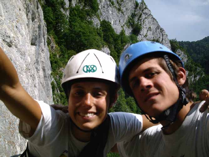 Le second jour nous allons dans les gorges à proprement dites où l’on peut, en plus de grimper, faire le saut à l’élastique le plus haut d’Europe. Le site est assez spectaculaire offrant deux parois face à face séparées d’à peine une cinquantaine de mètres. Nous nous engageons dans la classique de la falaise : Cesar Manea (grand alpiniste Roumain), 180m et 6 longueurs de 6b/6b+ assez soutenues toujours sans rencontrer le moindre spit.