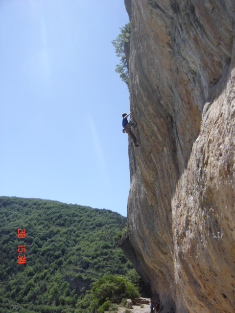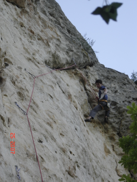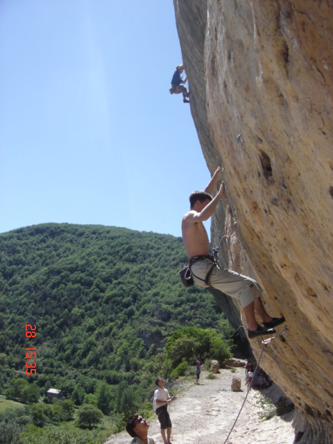 nous nous dirigeons vers les falaises du Boffi, lieu du futur PETZL roc-trip après avoir monter nos tentes au camping vers Millau. Apres une marche d’approche ou certains n’ont pas attendu les autres ;) on commence enfin a grimper. Quelque uns d’entre nous essayent meme un 8b+ mais celui ne rapporta pas de points car il ne fut pas enchainé. Oui car Rémi a créé un systeme de points ou chaque voie faite a vue et enchainée apporte un certain nombre de points en fonction de notre niveau max en falaise ….