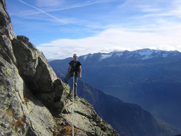 Nous pasons à côté du glacier de Freydanne et arrivons au lever du jour au col de la Balmette. La première partie de l'arète ne pose pas de problème, il y a de très nombreux becquets pour s'assurer ainsi que quelques pitons et mêmes parfois des spits. Nous arrivons ainsi rapidement au sommet du grand pic de belledonne, presé sans doute de retrouver le soleil. S'en suit une descente en rappel et une escalade très agréable, ou altèrne passage de gendarmes, escalade sur des rasoirs et dans de belles dalles, le tout ne dépassant jamais le IV, pour remonter au pic central de belledonne. Enfin, la dernière partie de la traversée permet d'arriver à la Croix de Belledonne, terme de cette course d'arète.