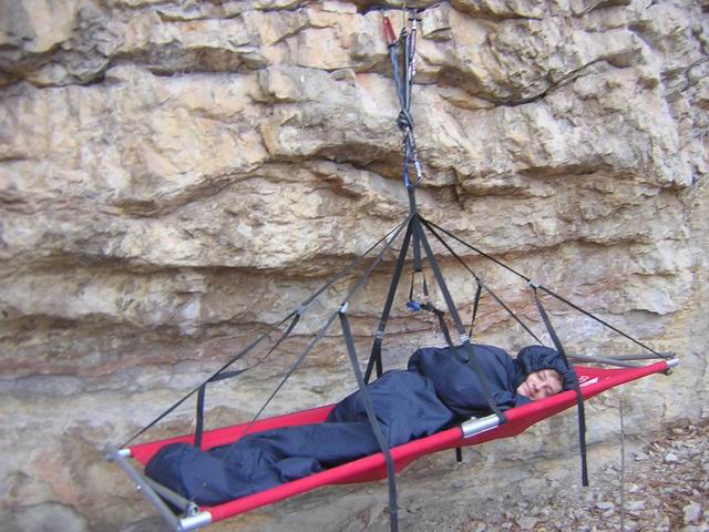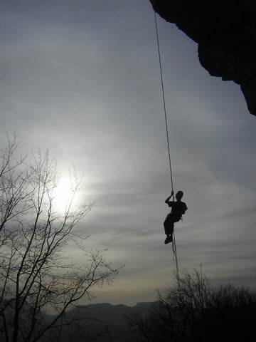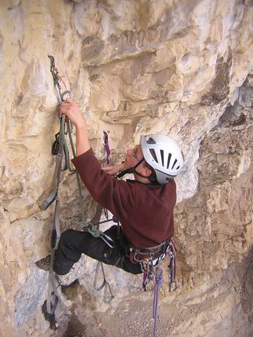 Mais bon, tant bien que mal, tout le monde arrive en titubant à la falaise. Pas le temps de poser les sacs que c'est déjà partis. Après une explication des techniques de base de l'escalade artificielle, on commence déjà a entendre les premiers coups de marteaux sur les pitons et les premiers " oula !! ca tient ça !! ". Le premier vol ne se fait pas tarder, et c'est Alexandre qui ce la colle en poussant un petit cri aigu...