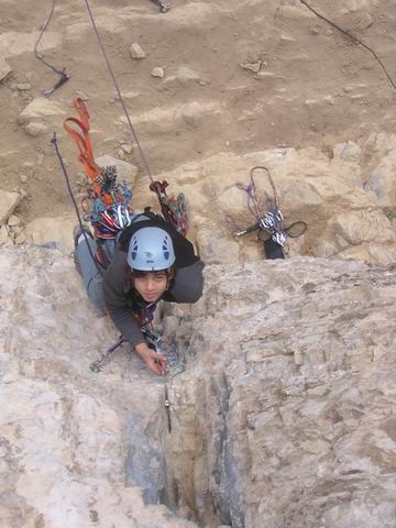 Dimanche rebellote, soleil de plomb. On s'échange les voies et on apprend: pose de crochets, bonne utilisation des friends et des cablés, pitonnage dans les fissures, on monte bien dans les etriers: pas de vols, ça commence à rentrer. Finalement, la fin de la journée arrive et le retour s'annonce. Ouf, plus de nourriture et d'eau, les sacs sont un peu moins lourds...