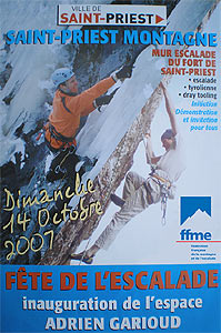 A l’occasion de l’inauguration de l’espace escalade Adrien GARIOUD (décédé au sommet du Mont Blanc après avoir effectué la traversée intégrale des arêtes de Peuterey), le club Saint-Priest Montagne organise la fête de l’escalade, au mur du fort de Saint-Priest.