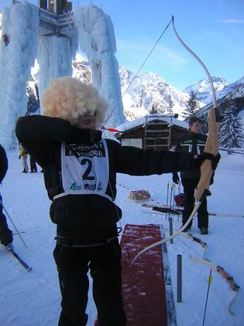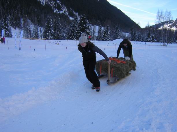 - samedi, attention accrochez-vous, journée de fou: enchainement des différentes épreuves proposées: parcours d'alpinismes avec saut de crevasse, marche sur des troncs glissants, lancer de piolets...; course de luge à foin (ou comment perdre ces poumons en 30 secondes); course de ski de fond et tir à l'arc (ou comment perdre un deuxième fois ces poumons), grimpe sur la tour de glace (ou comment perdre une troisième fois ces poumons + ces avants bras) et enfin, l'épreuve surprise: course de trainage d'énormes troncs dans un champs de poudreuse à 120 contre 120...).