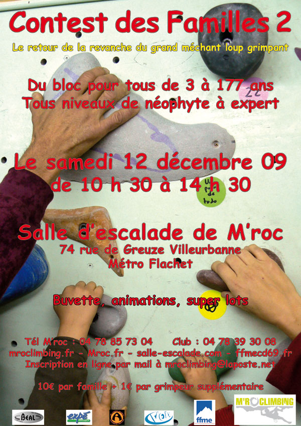Après le succès du Contest des familles en juin 2009, le club d'escalade M'roclimbing remet ça le samedi 12 décembre 2009 avec le "Contest des familles 2, Le retour de la revanche du grand méchant loup grimpant". Toujours à la salle d'escalade M'roc, rue Greuze à Villeurbanne. En hivernale, donc (rassurez-vous, c'est chauffé!).
