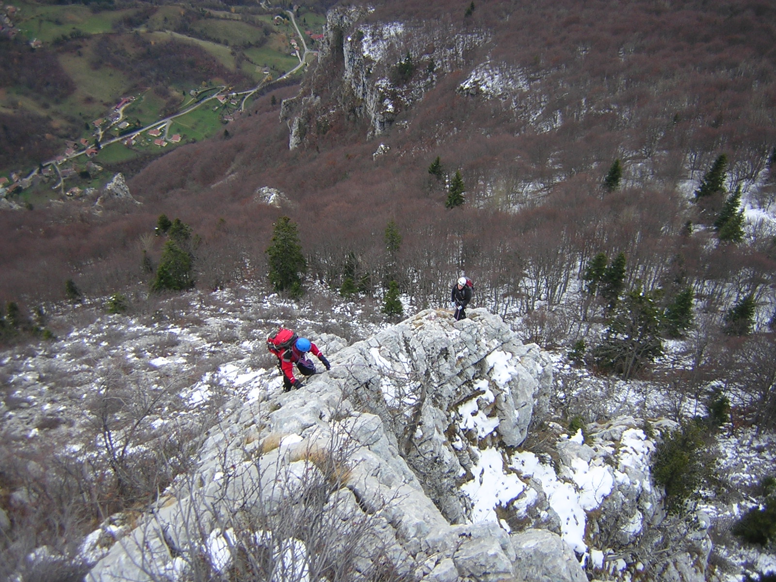 Préparation rapide des sacs au parking, puis direction l'arête Sud des Rochers de Chalves, notre premier objectif du week end. Les jeunes s'occupent de l'orientation: pas facile de trouver son chemin entre pistes forestières et sentes à chamois; la corde sera même sortie avant l'arête ! Après deux heures de marche, toute l'équipe arrive au départ de l'arête. Les trois cordées se préparent: aujourd'hui Bastien, Louis et Antoine mènent la course. Le joli calcaire de Chartreuse apparait. Progression à corde tendue, utilisation des anneaux de buste, pose de friends, cablés et de sangles, recherche de l'itinéraire et des bons becquets rythme la course. Sur l'arête, le maître mot d'une progression rapide et en sécurité apparait clairement: la gestion de l'encordement. Le sommet rejoint, nous traversons le plateau sommitale, un peu enneigé, pour rejoindre la descente sur le refuge des Banettes, notre abri pour la nuit. Nous mettons en place de petits exercices d'assurage en mouvement dans les pentes de neige au dessus du refuge. La fin de journée nous occupe: coupage de bois pour le poêle, séchage des vêtements humides, préparation de l'apéro. La nuit est bonne.