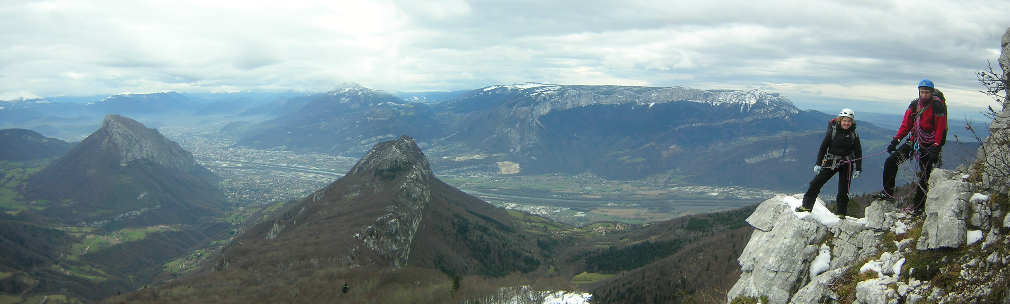 Le lendemain, direction notre deuxième objectif: la traversée des arêtes du Néron. Nous apprécions la descente du refuge: les lumières du matin sont magnifiques. Le départ de la course du jour est vite rejoint. Aujourd'hui, Maud, Antoine et Bastien mènent les cordées. La vire des Romains, la passerelle Hippolyte Muller, le bélvedère Lucky Luke, le passage du Z sont autant de points de repère que de passages ludiques. Aujourd'hui encore, les différentes techniques d'encordement et de progression s'alternent: anneaux de bustes, nœud du pécheur, assurage à l'épaule commencent à n'avoir plus de secret pour les jeunes. Au sommet, le picnic ensoleillé est la récompense. Nous nous délectons des vues sur la chaine de Belledonne, enneigée, et peut-être le lieu d'un prochain stage ? Hop hop, il reste la descente... Le couloir de Clémençiere permet une descente rapide et à 16h30 nous voila de retour au parking.
