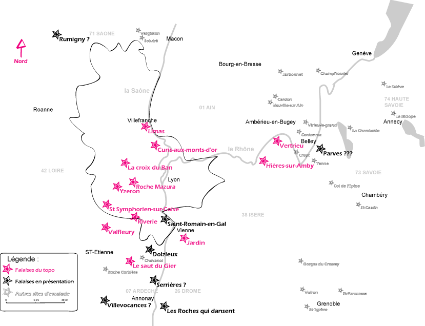 d'escalade à proximité de Lyon. Cette carte est issue du topo des sites d'escalade autour de Lyon